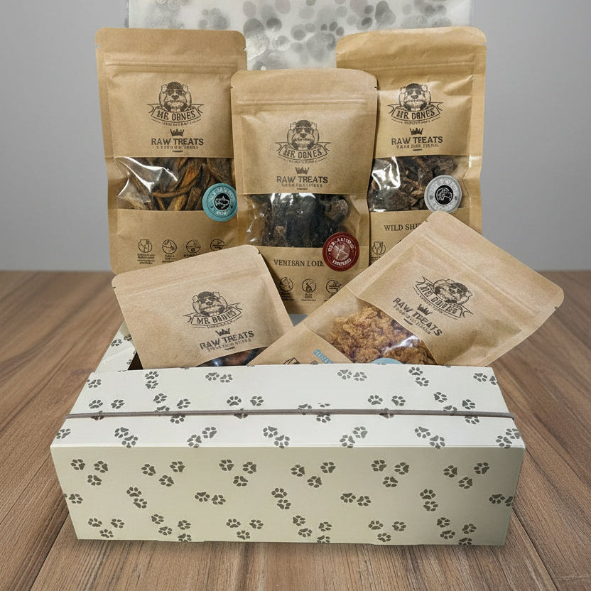 Treat your dog to a moment of pure bliss with our natural treat box, filled with high-quality, delicious goodies and beautifully presented in an adorable paw-print gift box, complete with matching tissue paper. The perfect gift for food-loving dogs 🎁