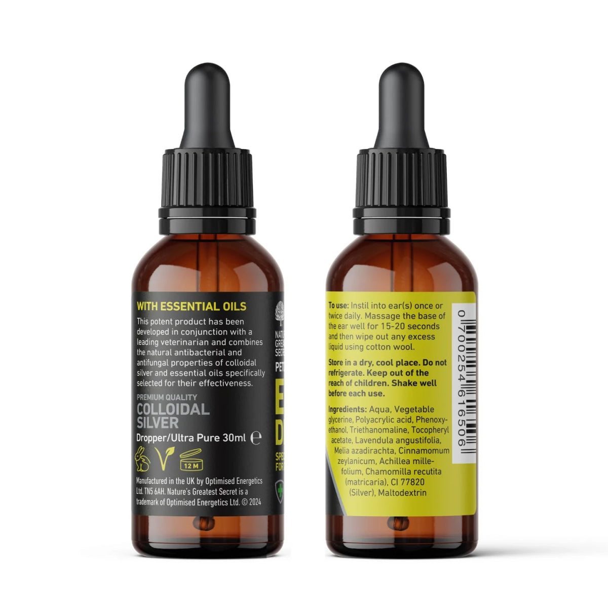 Developed in collaboration with Dr. Tim Couzens, a homeopathic veterinarian from the Centre of Holistic Veterinary Medicine (East Sussex, UK), this formula combines the antibacterial, antifungal and healing properties of colloidal silver with a blend of soothing and purifying essential oils.